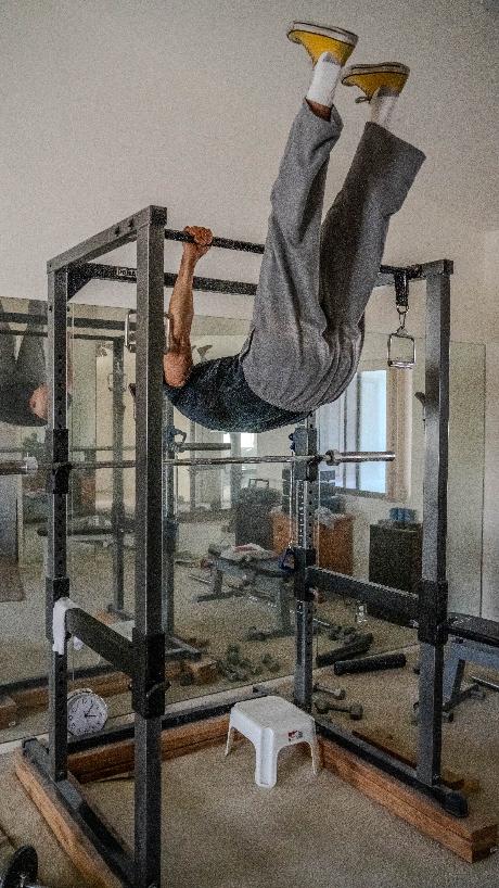 The second series of photos (below) show the hanging leg raise raising the knees above the level of the bar. On the internet you'll see all sorts of essays and U-tube clips talking about the importance of "the core." This exercise is by far the best exercise for the core. The abs of all the bodybuilders of the 50s and 60s were built with this exercise, yet very few people do this exercise anymore because of certain misinformation about it started by folks who didn't know how to do the exercise properly.